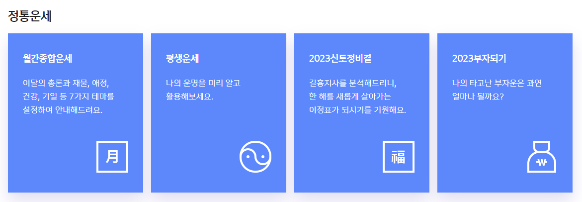 신한생명 홈페이지에서 제공하는 순자산 정보에는 실질 순자산과 종신 순자산, 연애/궁합이 포함됩니다. 그중에서 사람들은 가장 정통적인 운세를 봅니다. 새해가 되면 꼭 한 번은 가봐야 할 운세입니다.