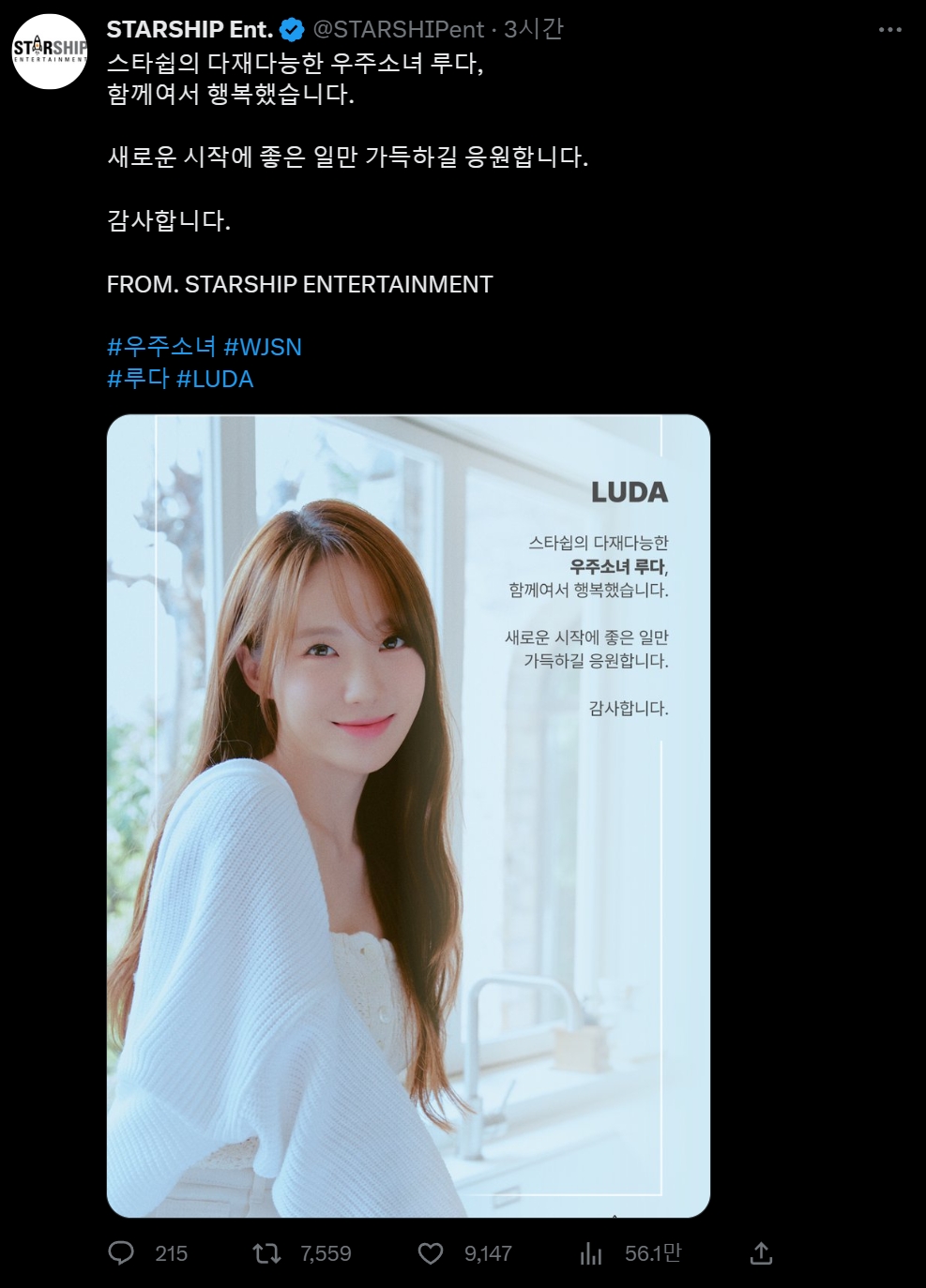 스타쉽 측은 “다재다능한 우주소녀 루다, 다원과 함께하게 돼 행운이었다. 여러분의 새로운 시작을 응원합니다. 감사해요.’ 안부를 전하는 메시지를 남겼다.