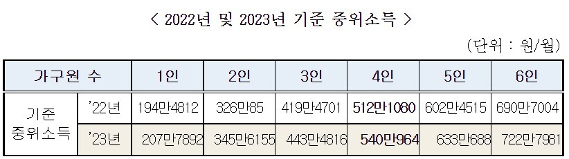 앞서 말씀드린 바와 같이 2023년 중위소득은 4인 기준 511,080원에서 2023년 540,0964원으로 전년 대비 5.74% 증가했습니다. 이에 기초보장 수급자격 기준이 되는 소득기준이 조정됐다.